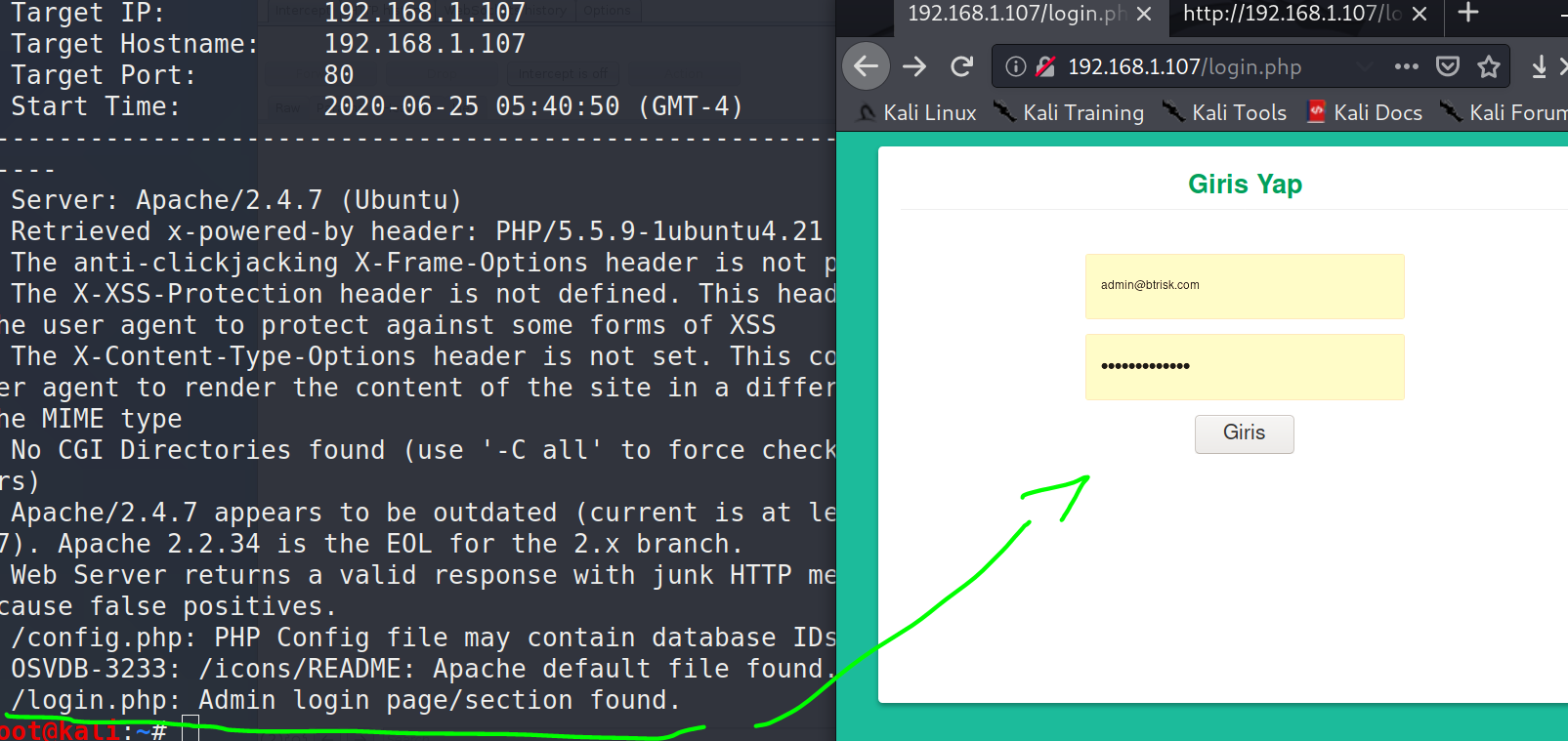 | nmap -sV 192.168.1.107 nmap -T4 -A -v 192.168.1.107 dirb http://192.168.1.121 nikto -host 192.168.1.107