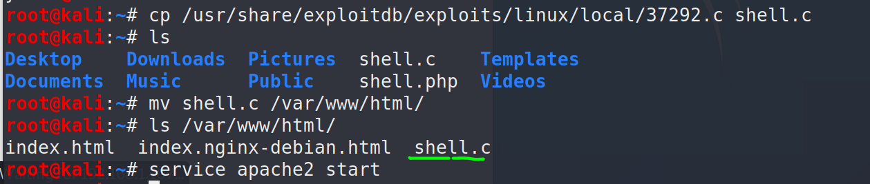 | cp /usr/share/exploitdb/exploits/linux/local/37292.c /var/www/html/shell.c service apache2 start