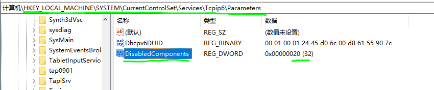 cmd打开RegEdit,导航到HKEY_LOCAL_MACHINE \ SYSTEM \ CurrentControlSet \ Services \ tcpip6 \ Parameters, 创建DisabledComponents DWORD注册表值,将其值设置为20(十六进制):