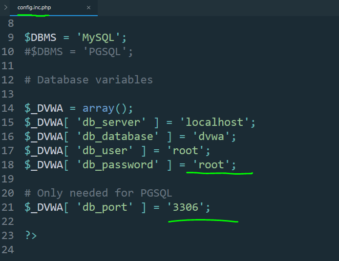 解压得到网站目录,拖到phpstudy根目录下,编辑WWW\dvwa\config\config.inc.php添加密码root,修改mysql端口为3306(phpstudy默认mysql端口)。