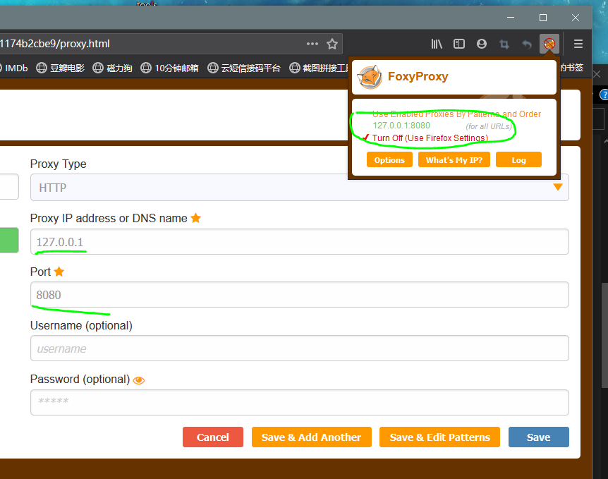 Firefox附加组件->商店搜索foxy proxy,安装完后添加新代理127.0.0.1:8080: